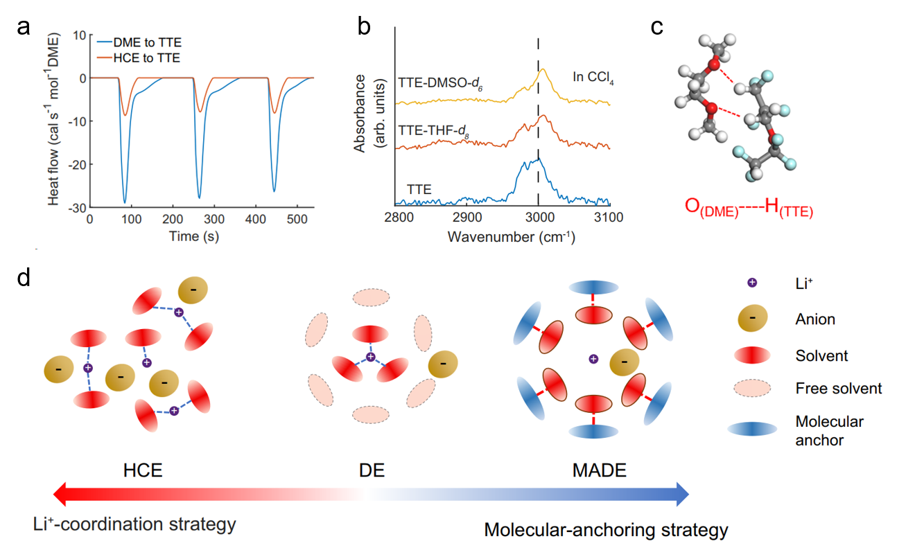 针对上述难题,作者提出一种全新的分子锚定策略,有望同时解决醚基电解液的高压和安全难题。他们在乙二醇二甲醚(DME)中加入含强极性C-H基团的氟代醚溶剂(TTE),发现DME和TTE之间可以通过氢键形成分子间的“锚定”作用,从而有效降低醚键上氧原子的电子云密度,大幅提高了溶剂的抗氧化能力。