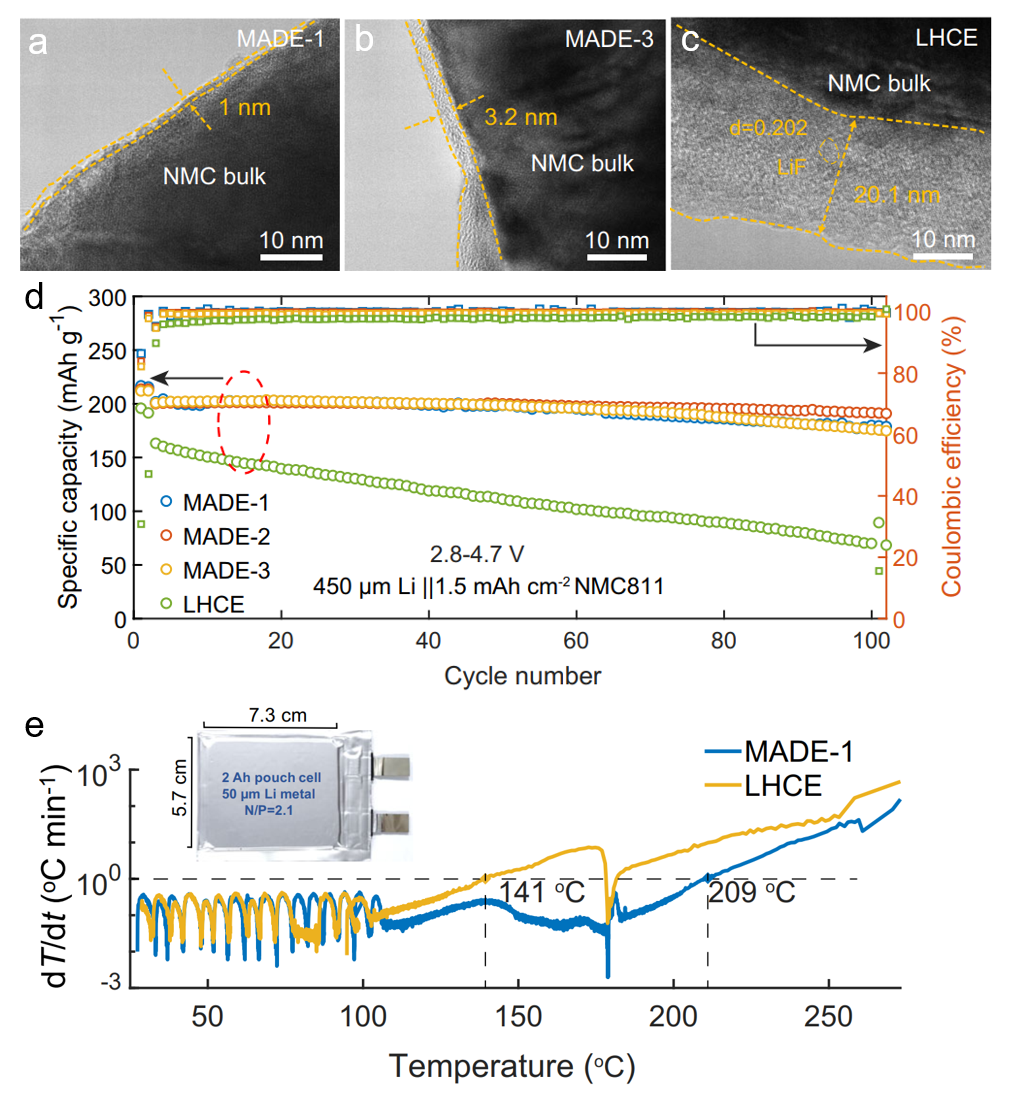 研究人员进一步考察了电解液的安全性能。在锂金属软包电池中,当温度升高到140C左右,高浓电解液与锂金属剧烈反应并放出大量热量,而分子锚定电解液与锂的相容性得到大幅提升。分子锚定电解液则可以将热失控开始的温度推迟到209C以上。这项工作证明,设计合理的分子间相互作用可以从根本上改变电解液的性能,为未来电池电解液的分子工程提供新的方向。