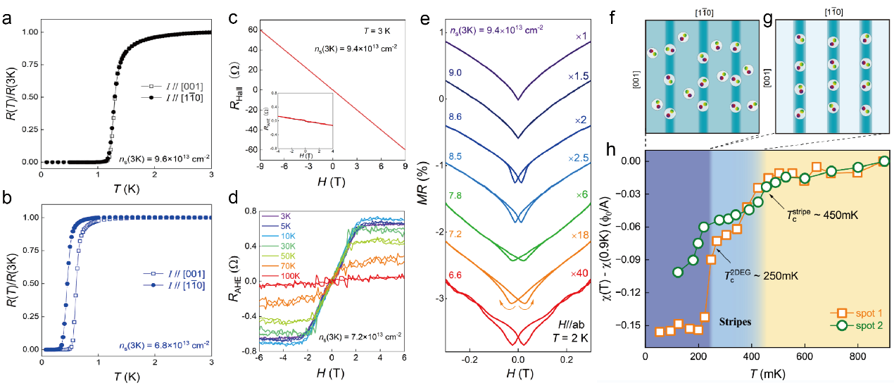 近年来,陈仙辉院士团队应用分子束外延(MBE)技术成功生长了由铁磁绝缘氧化物EuO和绝缘氧化物KTaO3构成的EuO/KTO(110)异质结,并在前期工作中发现了受电场调控的二维界面超导(npj Quantum Mater.7, 97 (2022));在此基础上,研究团队进一步通过调节界面二维电子气载流子浓度对该体系的超导电性及其与铁磁近邻效应的关联进行了系统研究,并与清华大学、复旦大学的研究团队合作进行了第一性原理计算和基于扫描超导量子干涉仪(Scanning-SQUID)的高精度磁测量。电输运测量结果表明在低载流子浓度的样品中,界面超导表现出反常的面内各向异性:沿面内[001]方向施加电流时,超导转变温度和上临界场都明显高于沿面内垂直方向([1-10])施加电流的情况;这种超导态的各向异性行为在高载流子浓度的样品中消失。超导转变温度与电流方向相关的现象极为罕见,它表明异质结界面发生了超导态维度降低的效应,即在二维平面内形成了沿[001]方向的一维超导条纹。ScanningSQUID成像实验进一步支持了超导条纹相形成的结论。同时,正常态电输运测量发现只有低载流子浓度的样品表现出反常霍尔效应和磁阻回滞行为,表明界面传导电子与EuO铁磁性的耦合受到能带填充的显著影响;第一性原理计算结果表明Eu原子4f轨道与Ta原子5d轨道的杂化效应在特定的能量范围内导致能带产生自旋劈裂,与上述实验结果相符。因此,EuO/KTO(110)异质结中奇特的一维超导条纹的出现被证明源于超导电性与磁性的耦合效应。