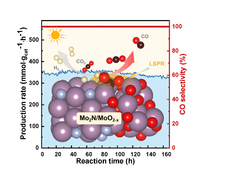 光热催化CO2加氢制备高值化学品和燃料是一种缓解能源和环境问题的有效途径。其中,活性位点和光吸收单元的精准设计是开发高效光热催化剂的关键。传统催化剂设计以氧化物负载等离激元金属助催化剂结构为主,其具有宽光谱光吸收、高效的光热转换效率和高比表面积等优点。然而,该类催化剂仍受到制备工艺复杂、成本高等问题的制约。基于此,作者设计了一种具备非金属等离激元效应的Mo2N/MoO2-x光热催化剂,并通过一步法在催化剂中实现双活性位点的可控调节,实现了高效、高选择性、高稳定性的光热催化CO2转化。在流动相条件下,Mo2N/MoO2-x催化剂CO生成速率高达355 mmol gcat-1 h-1,产物选择性超过99%,稳定性长达190小时。结合原位谱学表征和理论计算模拟,证明N原子和O空位双活性位点的协同作用能够同时促进H2和CO2分子在催化剂表面的吸附活化,从而有效降低反应能垒;另通过多种催化模式对比证明了光热催化在提高能量转换效率和热管理方面的优势。综上,这项工作为高效光热催化CO2转化提供了一种简单有效的催化剂设计思路和机理探究途径。