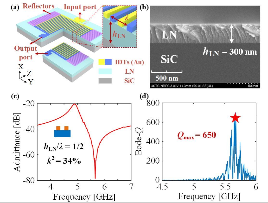 研究人员在X-cutLiNbO3-on-SiC衬底上设计并制备了一种高频、高机电耦合系数(k2)、高品质因数(Q值)的耦合剪切模态声表面波(X-SAW)谐振器。通过选择合适的欧拉角(α)和设计铌酸锂薄膜厚度(hLN)与叉指电极波长(λ)的比值,使得水平和厚度方向的电场同时激励两个剪切压电系数(e16与e34),并使它们共同作用到一个机械振动模态中,从而获得了机电耦合系数前所未有的大幅提升。