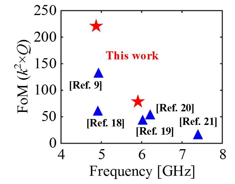 图2.近10年报道中4 GHz以上最具代表性的声表面波(SAW)谐振器FoM值