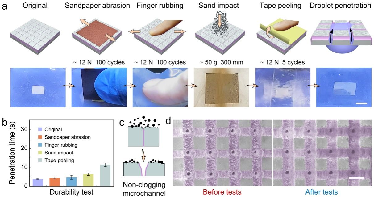对处于保护模式的Janus膜依次进行砂纸摩擦、手指按压、沙子冲击、胶带剥离等严苛测试,每次测试后将Janus膜拉伸到工作模式,并对水的单向透过时间进行统计。结果显示,Janus膜的功能仍能保持。此外,经过微小砂砾冲刷等测试后,微通道内部仍保持清洁无污染,证明保护模式闭合的微通道不仅能抵御机械冲击,还能防止污染物颗粒堵塞通道(图2)。