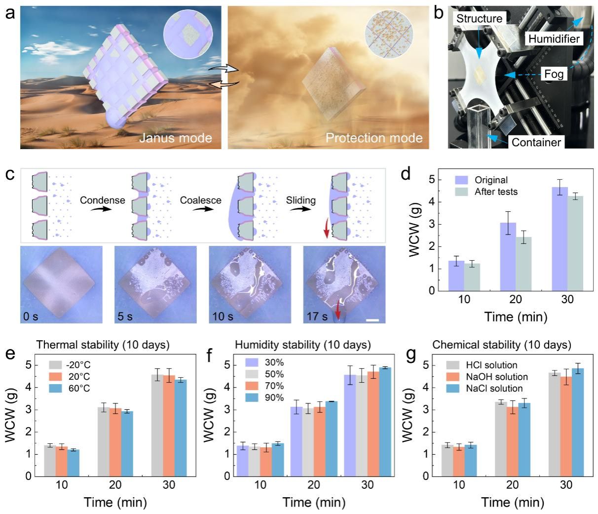 最后,作为概念验证,将模式切换耐用型Janus薄膜应用于沙漠环境下的水雾收集。例如清晨水雾弥漫无风沙时将Janus膜拉伸至工作模式进行水雾收集,而沙尘暴来临时切换为保护状态以抵御沙土摩擦冲击。对图2所示严苛测试前后Janus膜的水雾收集能力进行对比,以30分钟水雾收集量为例,结果显示严苛测试后收集量仅下降10%,展现了Janus膜的耐用水雾收集能力。另外,考虑到水雾收集器实际应用环境的复杂性,将保护模式Janus膜放置于不同温度、不同湿度以及不同化学环境条件下进行长期储存实验。结果显示经过10天储存的Janus膜的水雾收集能力与原始薄膜基本保持一致,展现了Janus薄膜的热稳定性、湿度稳定性以及化学稳定性(图3)。本研究提出的模式切换策略对于推动Janus薄膜在多相分离提纯、微流体操控与可穿戴健康监测贴片等多种领域的实际应用具有重大潜力。