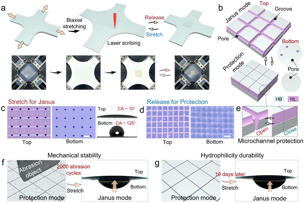 该团队利用飞秒激光刻蚀在预拉伸硅胶基底上制备出由栅格状微槽与微孔构成的三维微通道,并对微槽面进行亲水涂层修饰,而背面仍保持硅胶本征疏水性实现Janus功能。硅胶释放后微槽、微孔封闭保护微通道内的亲水涂层以抵御机械冲击。拉伸工作模式、释放保护模式的按需切换赋予了Janus薄膜机械耐久性,保护模式不仅能抵抗持续性机械摩擦,还能作为储存模式减缓亲水涂层的失效,实现单向水透过功能长期保持(图1)。