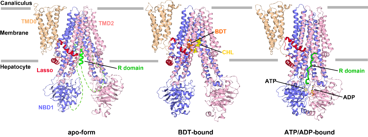 结构分析表明,apo-form ABCC2结构呈现向细胞质基质开口(inward-facing)的构象,两个核苷酸结合结构域(NBD)彼此分开。连接NBD1与跨膜结构域TMD2的调控结构域(R-domain)折叠成发夹结构,并结合到底物转运口袋中,阻止底物的结合,将蛋白质锁定在非活性构象。一旦结合生理底物类似物--二牛磺酸胆红素(BDT),ABCC2仍然处于inward-facing构象,但是R结构域从底物结合口袋中释放。基于结构和生化分析结果,我们推测R结构域作为竞争性亲和力过滤器,阻止某些低亲和力底物的结合,以确保高亲和力缀合胆红素优先向外转运。ATP结合进一步促进ABCC2的构象转变,NBD二聚化后ATP分子被水解,ABCC2转变为封闭构象,底物释放到胆小管中。在这种构象中,R结构域与跨膜螺旋TM14和TM15结合,使ABCC2稳定在这种ATP/ADP结合的活性转换中间态,确保底物的有效转运(图2)。基于上述研究,可以清晰解释R1150H突变体因为减弱了R结构域与TMD2的结合,使得ABCC2的转运活性受损,因此导致临床疾病。该研究不仅描绘了ABCC2在R结构域精细调控下的分子模型和底物转运机制,还为ABCC2功能异常导致的杜宾-约翰逊综合征的提供了分子病理学依据。