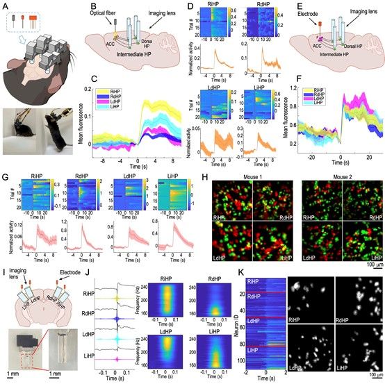 TINIscope的尺寸和重量优势使其与其他方法相结合变得更加容易。研究人员在四个海马亚区同步记录的实验基础上,还在扣带回进行光遗传或电生理刺激,并记录到了对刺激有响应的神经活动。此外,研究人员还结合了电生理记录技术,在四个钙成像区域附近,同步记录其局部场电位活动,并从中检测到了尖波涟漪(Ripple)放电。