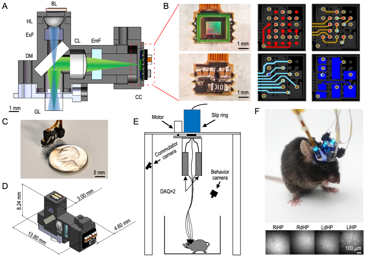 该工作直接面向多脑区同步记录的需求,通过系统优化光学、电子学和机械方面的设计,开发了目前世界上最轻的(0.43克)的超紧凑头戴式荧光显微镜——TINIscope,并在自由活动的小鼠上实现了对四个海马亚区神经元钙活动的同步成像。TINIscope为神经科学家提供了一种新的重要研究手段,用于探索动物在感知、认知和行为等方面的神经元级别的跨脑区协调作用。