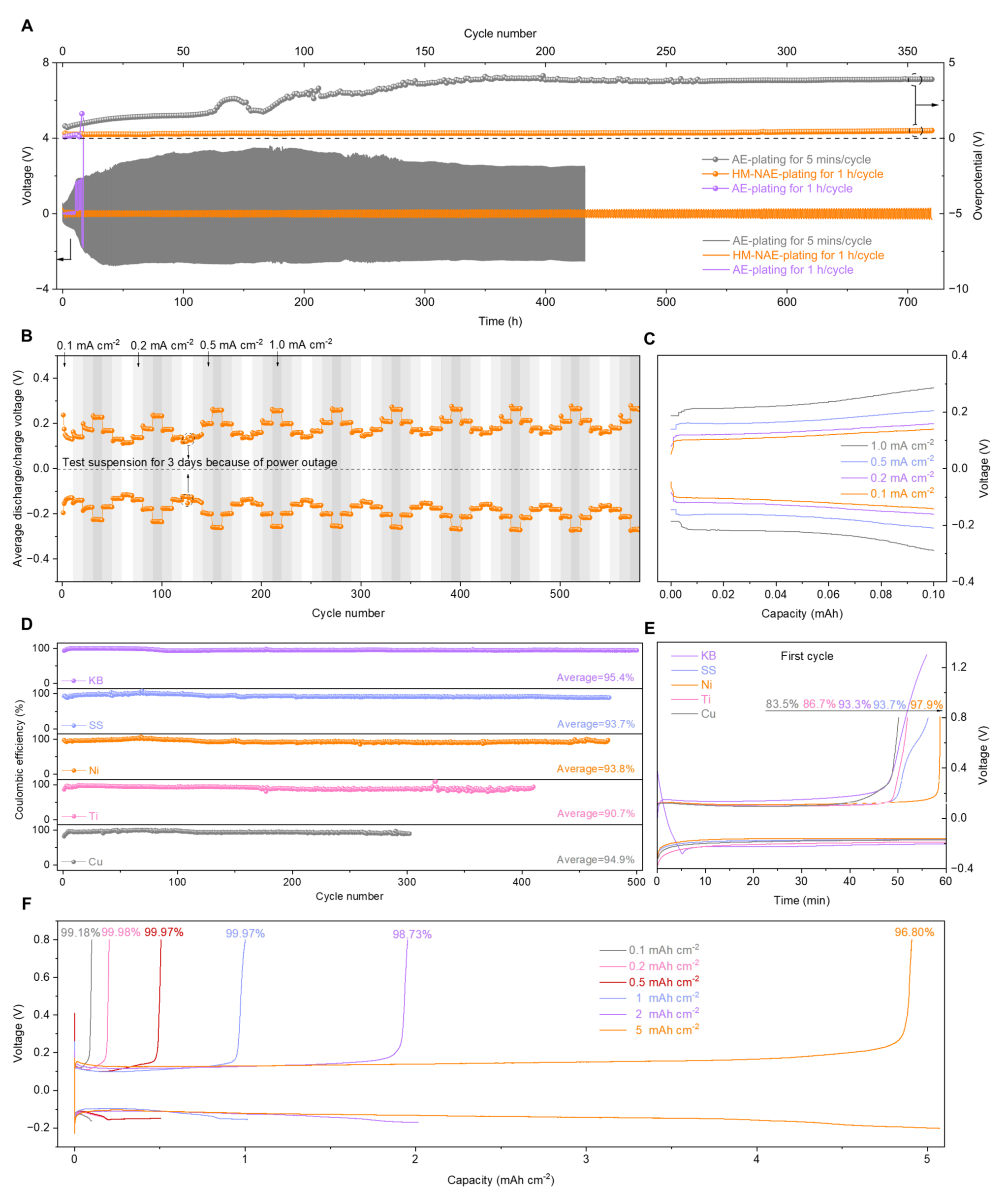 为了证明该卤素介导电解液的可靠性,作者首先组装了对称电池和非对称电池。数据表明,在0.1mAcm-2的电流密度下该电解液能够支持对称电池稳定循环超过700h,该性能远超现阶段已知报道的锰金属电池电解液(图3A)。在不同的电流密度下,对称电池都展示出良好的极化曲线和循环稳定性,充分证明了该电解液优异的的倍率性能。此外,即便在不同的金属或非金属集流体上,该电解液都可以提供将近100%的库伦效率以及<200mV的沉积/溶解过电位。在使用科琴黑作为集流体时,由该电解液组装而成的非对称电池甚至可以稳定循环超1000h。值得注意的是,即便是在更高的面容量下(5mAhcm-2),锰的沉积溶解效率依然高达96.8%(图3)。