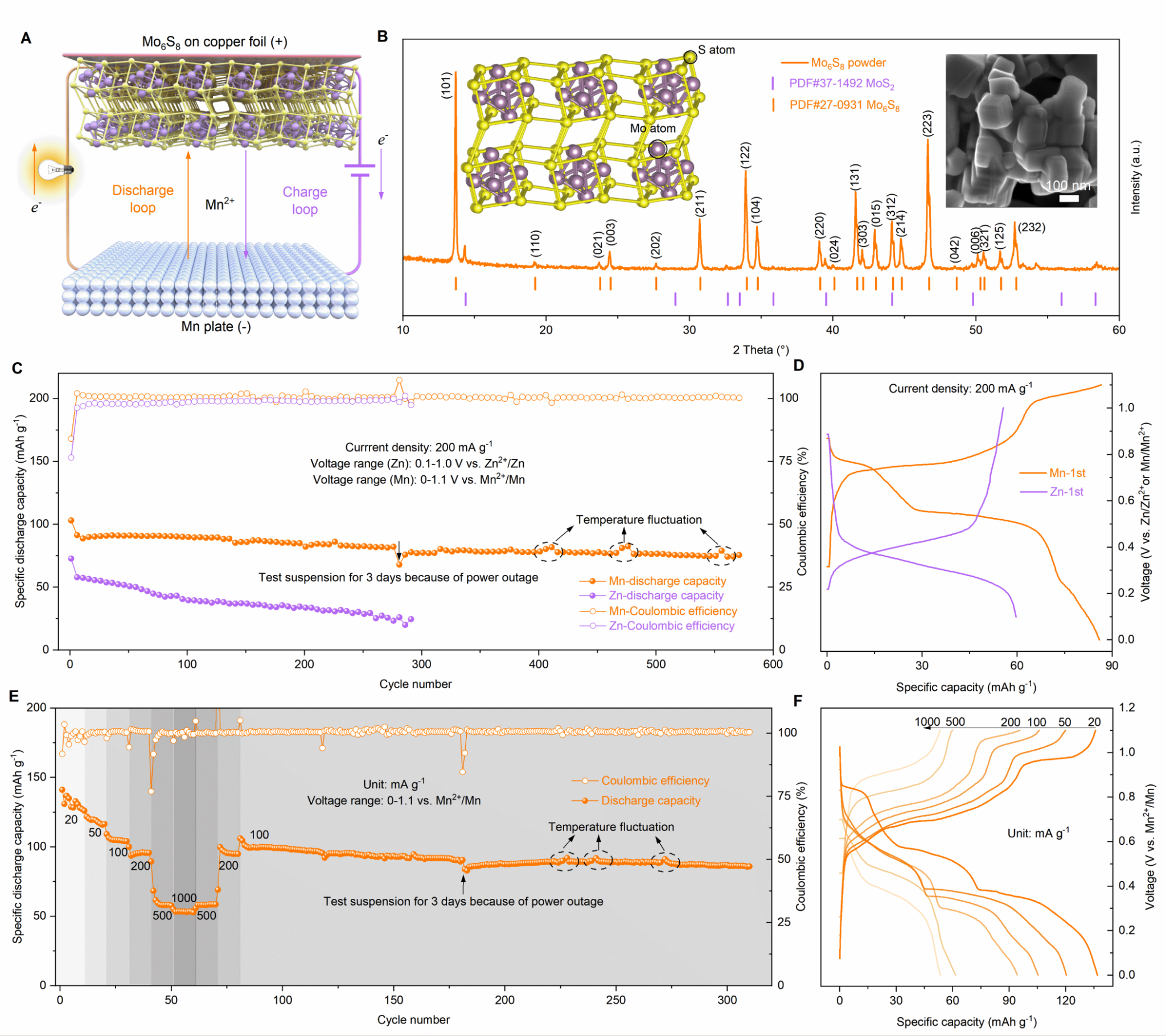 图4.基于卤素介导电解液的非水系Mo6S8(+)||Mn(-)全电池的电化学性能。