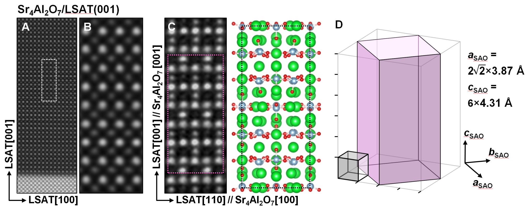 图2:超四方相水溶性牺牲层Sr4Al2O7的原子结构。图2A-C为Sr4Al2O7薄膜的高分辨透射电子显微图像和对应的晶体结构示意图。图2D为Sr4Al2O7单胞与钙钛矿氧化物单胞的相对大小和外延生长关系示意图。