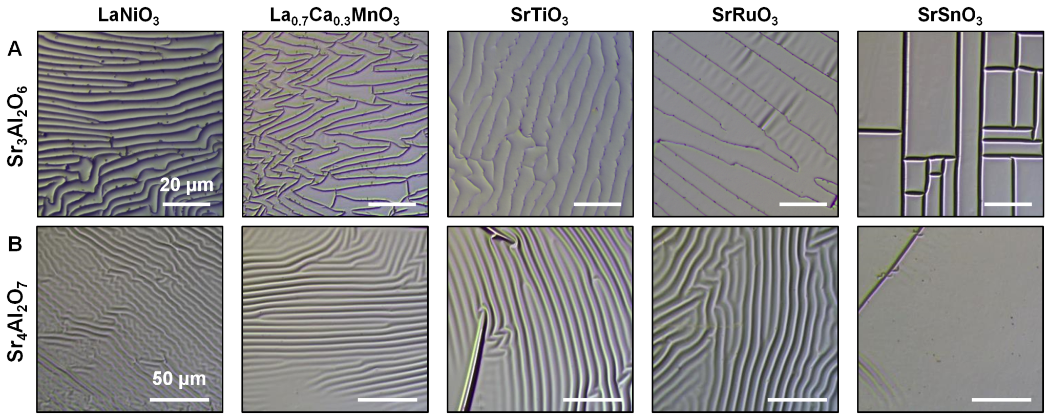 图3:使用不同种水溶性牺牲层剥离自支撑氧化物薄膜的完整性比较。图3A为基于国际上广泛使用的Sr3Al2O6牺牲层剥离的多种钙钛矿氧化物自支撑薄膜的光学显微图像。所有薄膜上都存在高密度裂纹。图3B为利用新型Sr4Al2O7牺牲层剥离的多种钙钛矿氧化物自支撑薄膜的光学显微图像。所有自支撑薄膜均表现出“皱而不裂”的表面形貌,预示着结晶性和完整性的显著提升。