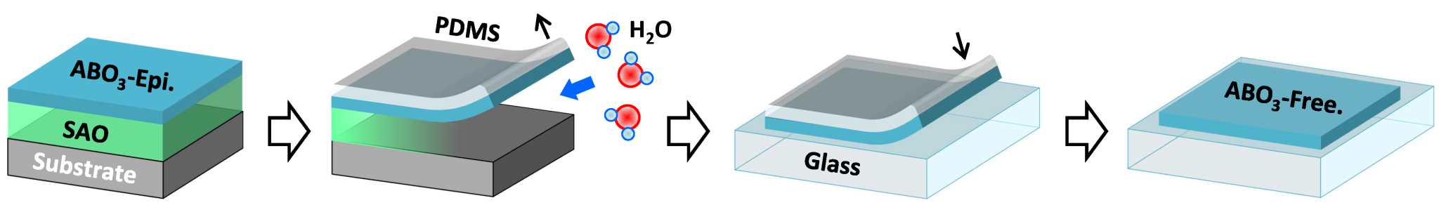 图1:基于水溶性牺牲层的自支撑氧化物薄膜的剥离和转移过程示意图。