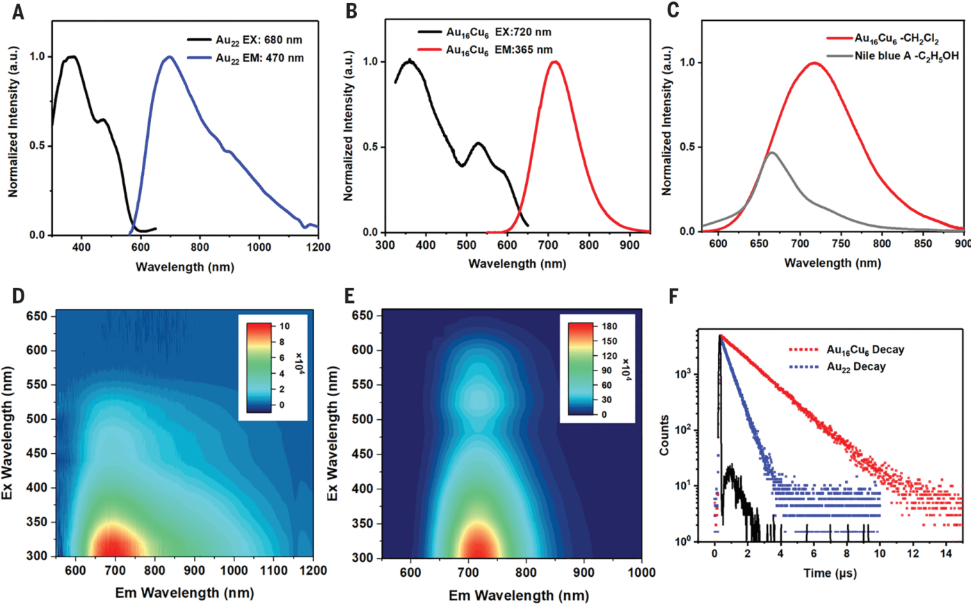 图2. Au22和Au16Cu6在二氯甲烷中的发光性质
