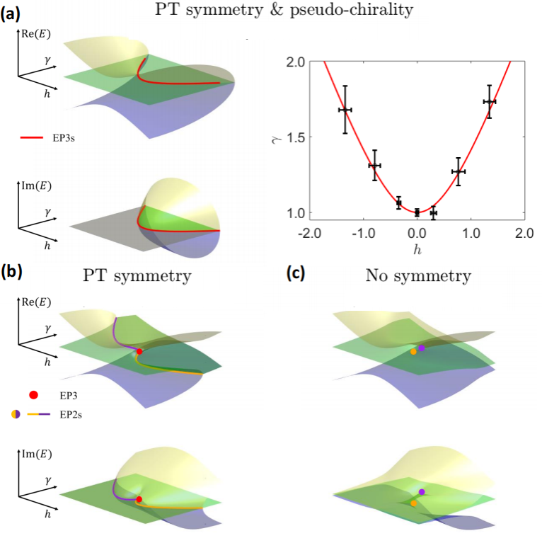 图:不同对称性下的非厄米体系的能谱及奇异点结构。三种颜色的曲面分别对应非厄米哈密顿量的三个本征能量,黄色与紫色点(线)为二阶奇异点(线),红色点(线)为三阶奇异点(线)。图a为体系同时具有宇称时间对称性和赝手性的情况,此时能够观测到三阶奇异线的存在。图b为体系仅具有宇称时间对称性时的情况,三阶奇异点以孤立点的形式存在于二维参数空间。图c为体系无对称性时的情况,二维参数空间中不存在三阶奇异点,仅存在二阶奇异点。