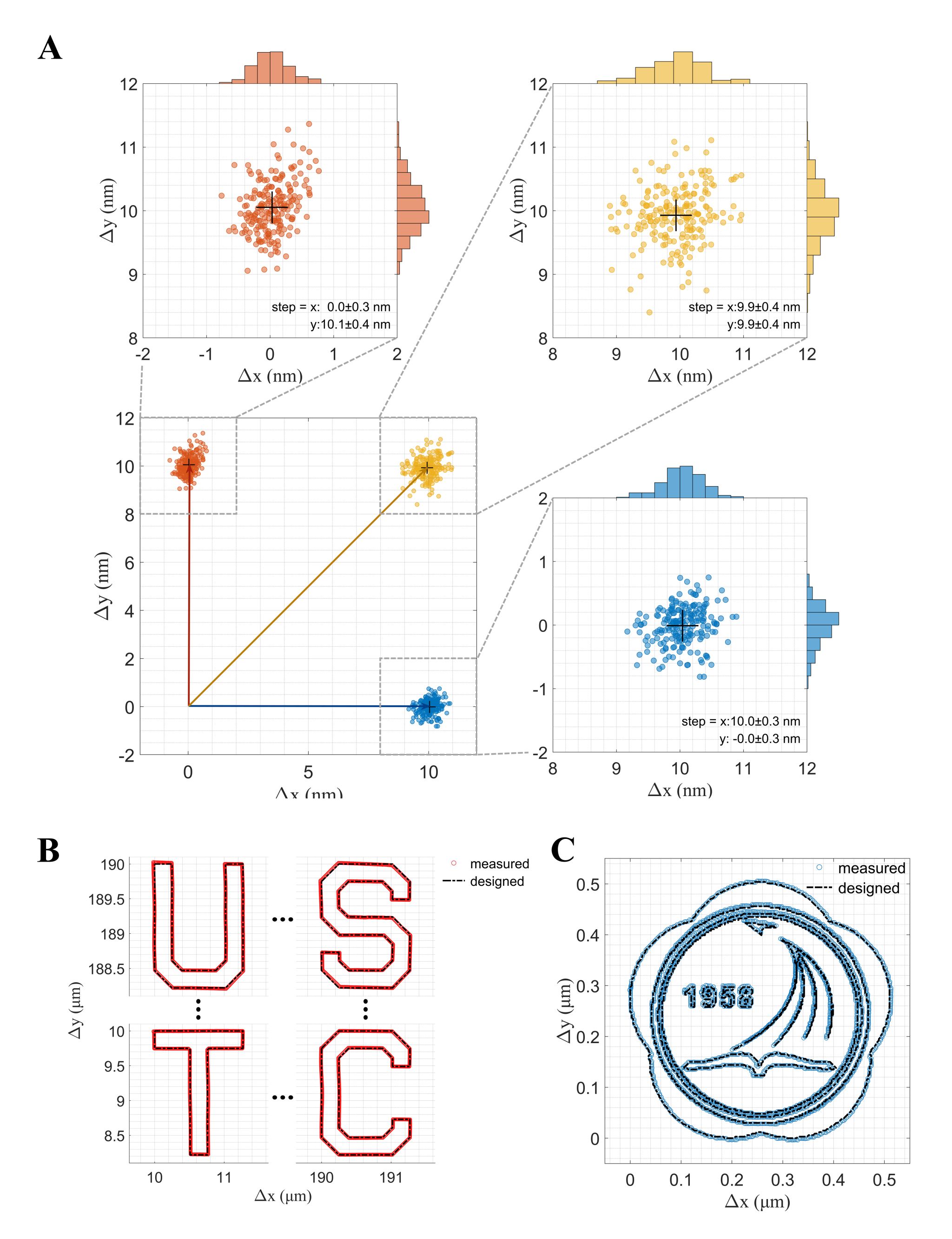 图2(a)二维位移测量系统的测量精度;(b)长间隔距离的四个字母形状路径的测量结果;(c)亚微米尺寸复杂图案边缘路径的测量结果。