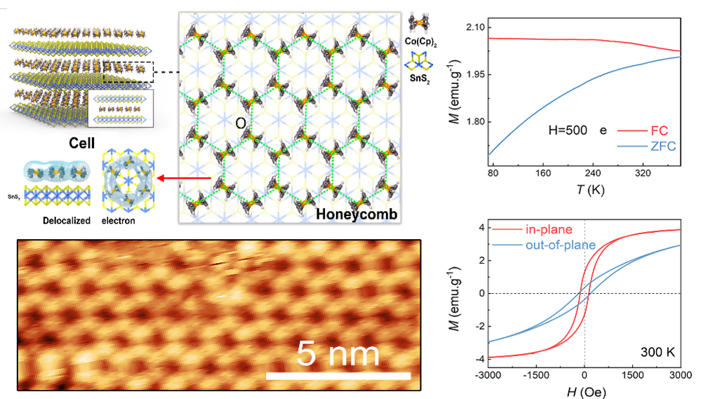 为了解决这一挑战,该团队以有机分子(二茂钴(Co(Cp)2)作为磁性基元,基于无机层状材料层间的限域效应,利用插层化学构建了长程有序的室温磁性分子单层。基于有机-无机(Co(Cp)2/SnS2)超晶格界面处动态电荷转移发展了二维-[Co(Cp)2-S2-- Co(Cp)2-]-共振超交换新机制,实现有机分子基元间长程磁有序结构,得到高的临界温度(> 400 K)和弱场下强磁性(4 emu.g-1)的二维铁磁分子层。通过STM和AFM联用的扫描探针显微技术成功表征出限域在SnS2层间的单个Co(Cp)2分子的取向和形成的单层分子类蜂巢状阵列,其中相邻Co(Cp)2分子的电子云相互弥散形成具有的类似石墨烯体系的离域电子态介导了Co(Cp)2分子之间的自旋交换相互作用。该工作通过调控分子自旋有序,实现新结构的磁性固体,有望为电子技术、信息存储和量子计算等应用领域提供更好的解决方案。