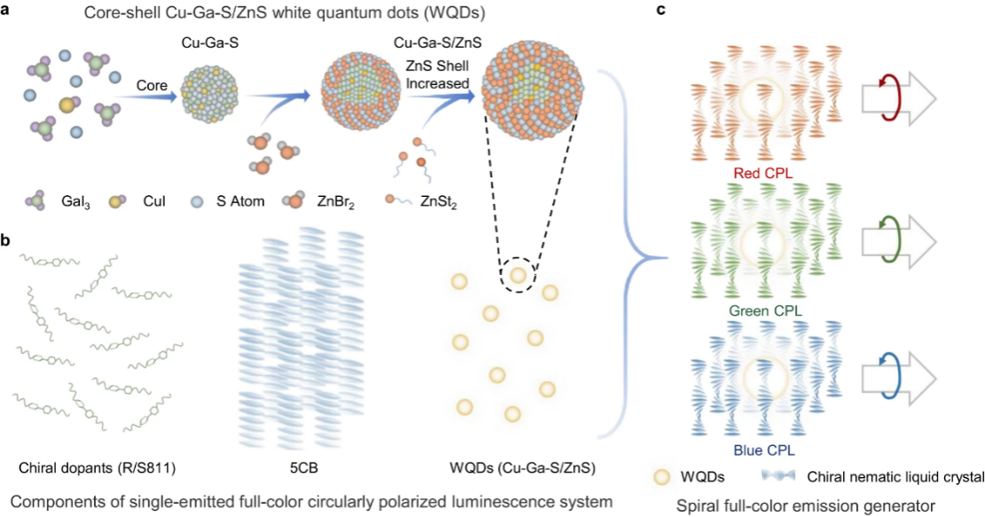 在本工作中,研究团队利用螺旋笼状组装策略,将高质量的无机白色宽谱发光量子点与手性液晶相复合。该类材料实现了可见光谱范围内的可调圆偏振发光(图1),其发光不对称因子高达0.8。通过调控手性向列相液晶的光子带隙,实现了全彩圆偏振发光,并进一步优化结构展现了白色圆偏振发光。为后续获得可准确定制波长的圆偏振发光器件奠定了材料基础。