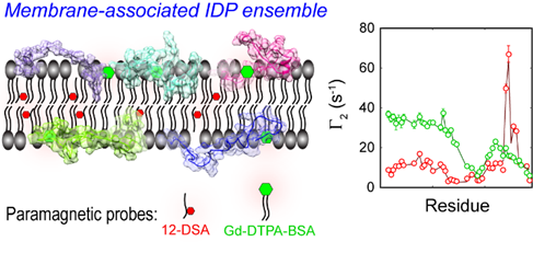 天然无序蛋白(intrinsically disorder protein, IDP)广泛存在于真核生物的蛋白质组中,并在遗传信息转录、信号转导等生命过程中发挥关键作用。如何对天然无序蛋白高度柔性和异质的构象进行高分辨刻画一直是该领域方法学发展中的重点问题。超过15%的IDP分子在细胞内处于膜结合状态,它们在磷脂双分子层环境下的内部及全局运动(internal and global motions)与其理化性质和生物功能息息相关,但这些动态过程难以通过常规结构分析方法进行捕获和定量表征。