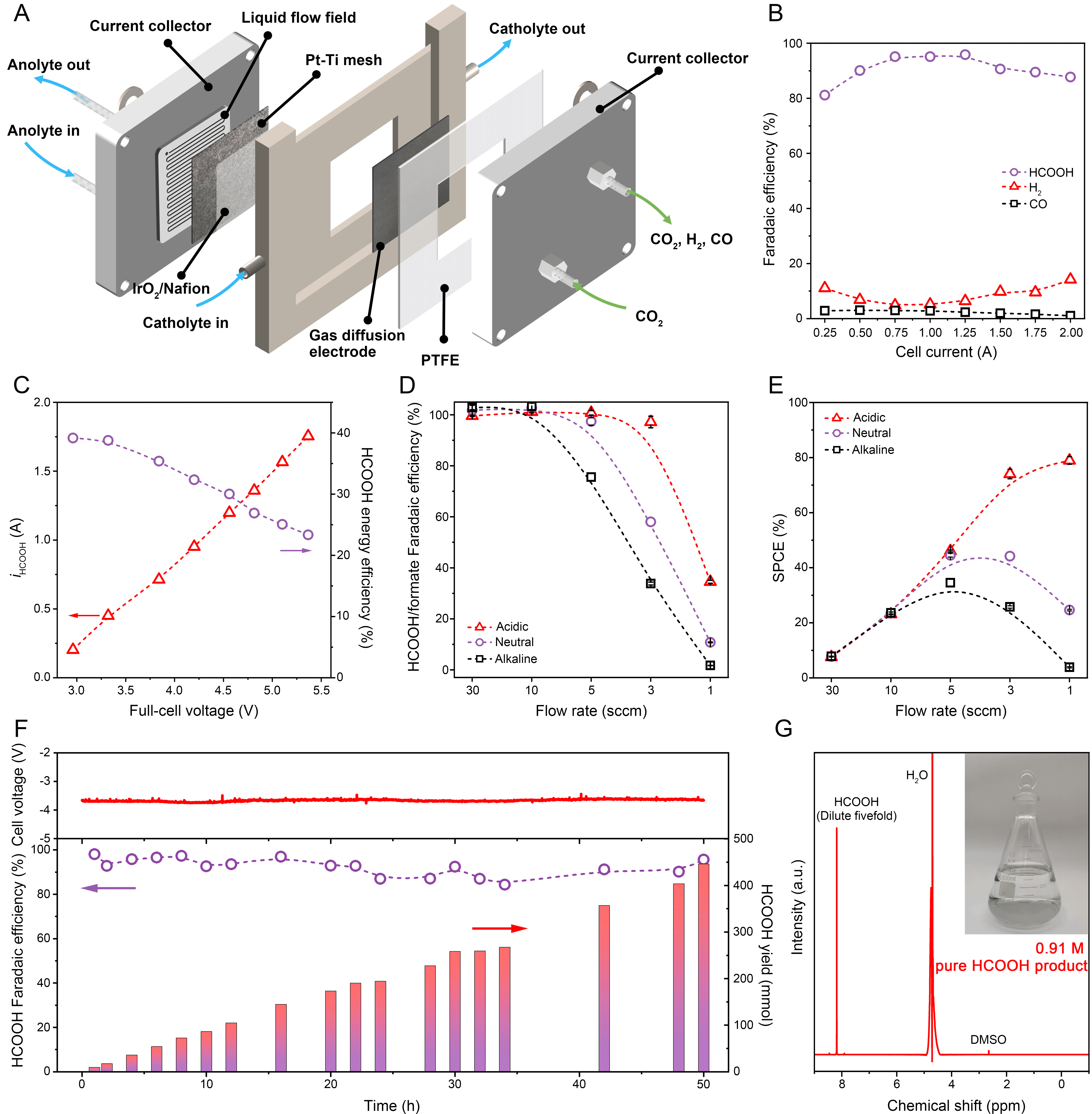 最后,研究人员在超薄流动电解槽中测试“储液池”催化剂的二氧化碳转化性能。在电流为1.25 A时,“储液池”催化剂的甲酸法拉第效率达到95.8%;在槽压为−2.96 V时,甲酸全电池能量效率达到~40%,单程转化效率可达79%(图4)。通过在0.5 A电流下稳定电解50小时,研究人员最终电合成了360 mL纯度为4.2重量%(0.91 M)的甲酸水溶液。