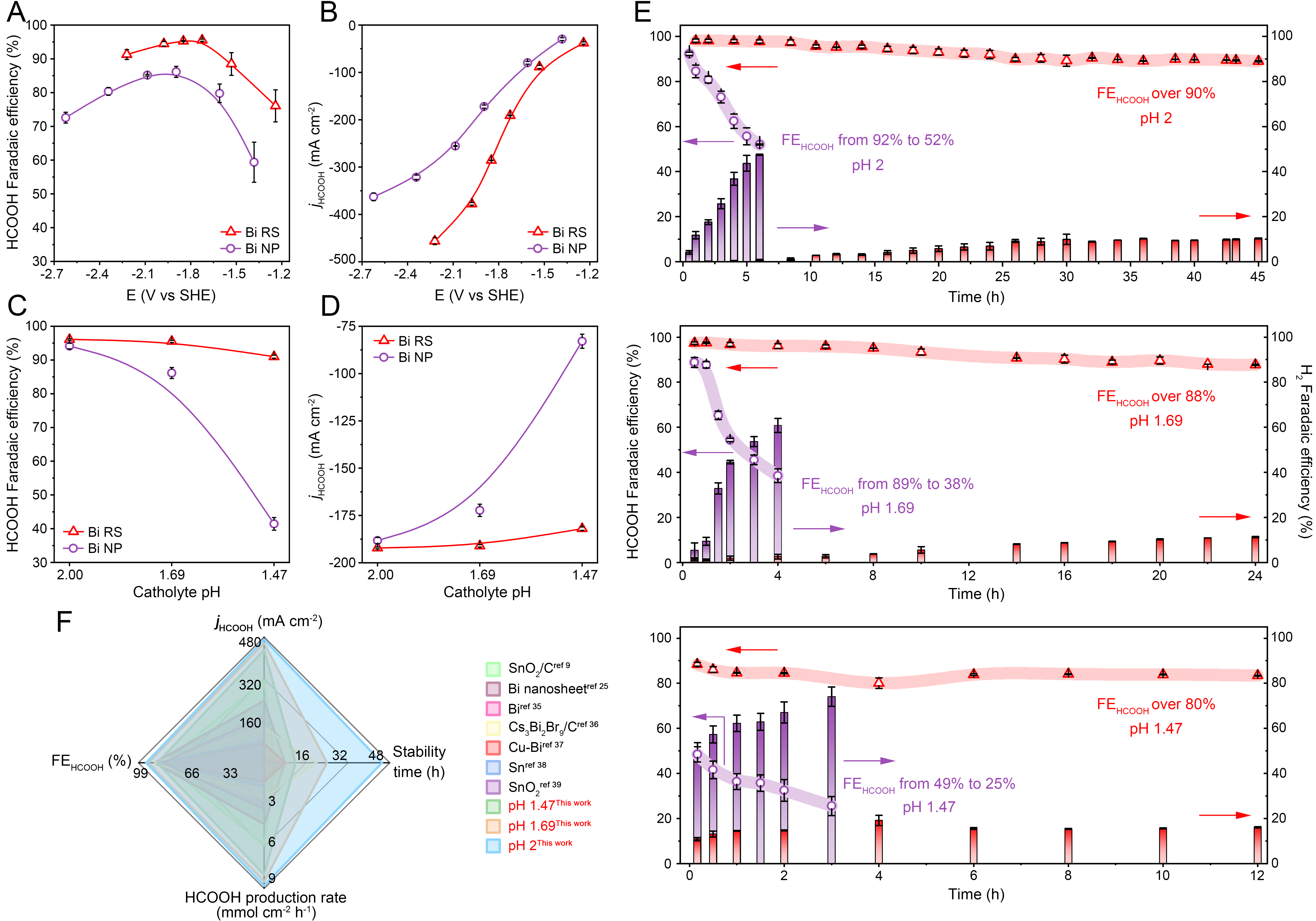 通过线性扫描伏安曲线测试,研究人员发现不同pH电解液中“储液池”催化剂的质子极限扩散电流密度均小于颗粒催化剂,说明“储液池”结构能抑制质子扩散至电极表面。原位拉曼光谱和红外吸收光谱测试结果发现“储液池”催化剂表面的pH均高于铋纳米颗粒,且能在更低的电位形成νO-C-O(HCOOH中间体)吸收带(图3)。这些结果进一步说明“储液池”结构在电极表面营造了局域强碱性微环境,抑制了析氢竞争反应,实现了酸性介质中二氧化碳到甲酸的高效转化。