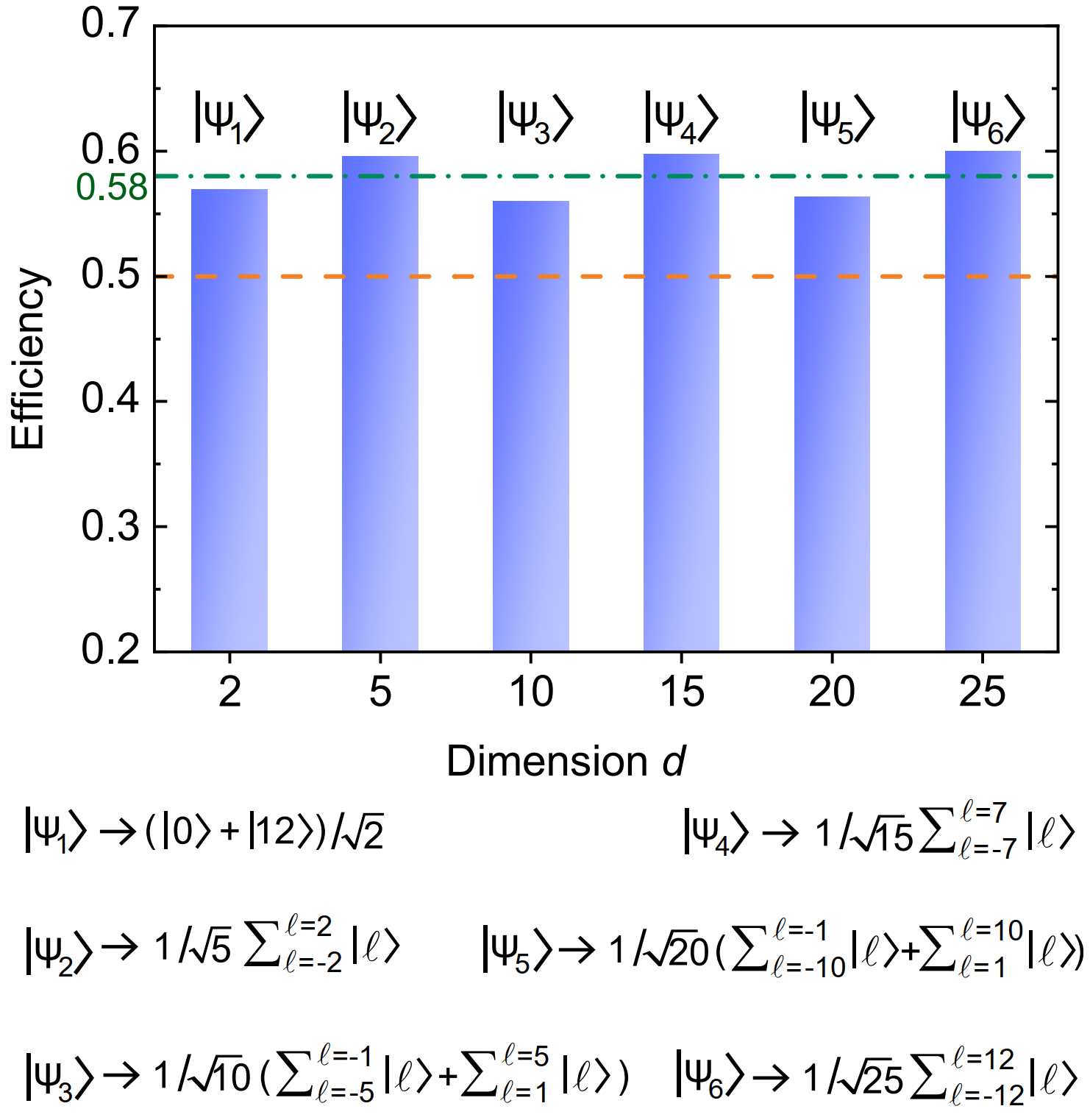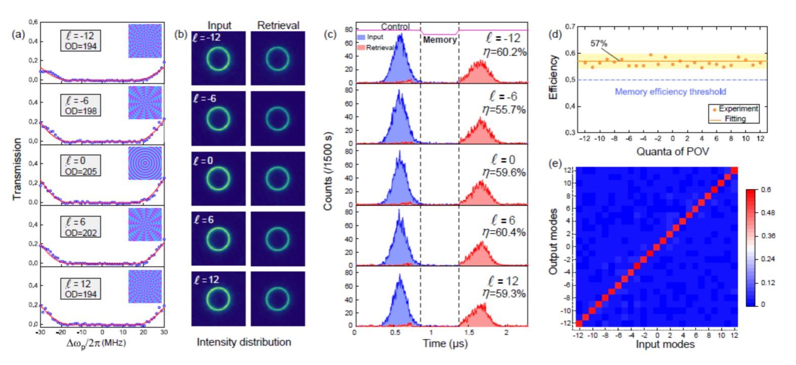 为了解决这一难题,近年来史保森教授带领的科研团队开展了高维量子存储器的深入研究,在以前研究进展的基础上,最近他们利用通过激光冷却与囚禁技术获得的大光学厚度的冷铷原子团作为存储介质,以完美涡旋光作为信息载体,并采用轨道角动量作为信息编码自由度,利用完美涡旋光的横截面大小与轨道角动量拓扑荷数无关的特点,实现了25维的光量子态存储,效率达到60%。由于该存储器对25个轨道角动量模式态具有相同的存储效率,因此不仅可以存储一个25维量子态,也可以对一个由25个轨道角动量模式任意组合的高维量子态进行高效率存储,显示出对任意可编程量子态的兼容能力,因此该结果在实际量子通讯中具有重要应用价值。