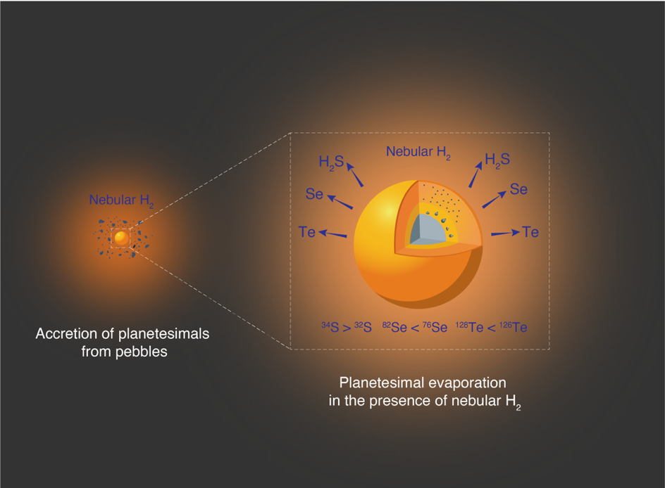 研究团队关注了硫族元素(硫、硒和碲)的同位素。通过第一性原理计算发现,在早期太阳系星云氢气未完全散去的情况下,星云物质凝聚形成星胚导致熔融挥发会使得星胚富集轻硫、重硒和重碲同位素;而核幔分异不会导致明显的硫、硒和碲同位素分馏。这一结果与地球的观测结果十分吻合,即地球相较于其初始物质具有偏轻的硫同位素组成,但具有偏重的硒和碲同位素组成。进一步模拟表明,星胚挥发丢失大约90%的硫、硒和碲可以同时定量解释地球的低硫同位素比值、高硒和碲同位素比值,而“后期增生”的作用可忽略不计。