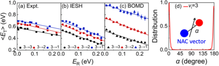 分子与金属表面相互作用时,分子振动能量的转移在其中起着重要的作用。由于金属具有连续的电子能级结构,分子振动不仅可以通过传统的绝热途径与分子平动、转动以及表面声子发生耦合,还可以通过激发金属中的电子—空穴对发生非绝热能量转移。大量研究表明,这种振动—电子耦合介导的能量转移广泛存在于各种物理化学过程中,是决定分子振动寿命、金属电子发射以及等离激元催化等关键过程的重要机制。其中激发态NO分子在Au(111)表面的散射过程,被作为研究表面振动能量转移的代表性模型体系,在近25年被实验和理论广泛研究。该体系积累了大量态到态散射动力学的实验数据,成为验证金属表面能量转移动力学理论研究最好的试验场。此外,其中分子振动与平动是否通过电子耦合以及立体动力学的动力学机制等问题仍困扰着学界,尚未得到定量理论解释。