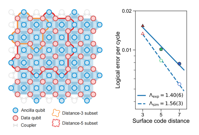 图1. 左:随着码距增从3(橙色框内比特)增大到5(红色框内比特)再到7(所有彩色标注比特),右:逻辑错误率指数下降