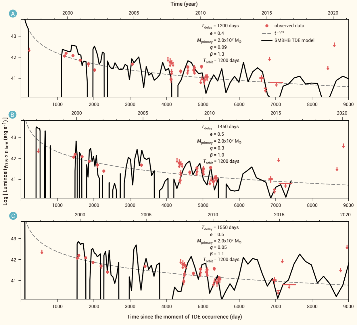 图2 超大质量双黑洞潮汐撕裂恒星事件模型拟合XID 935的光变曲线