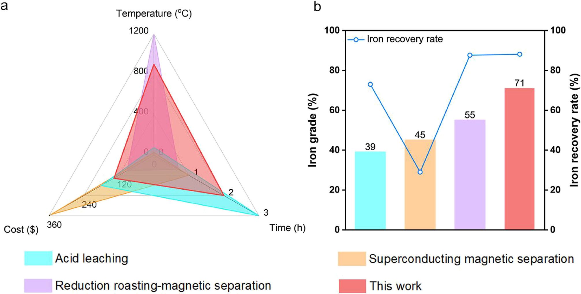 相比传统赤泥提铁方式,该工艺产生的赤泥残渣 pH 值降至接近中性(7.8),且元素浸出量极少,无需额外进行昂贵复杂的中和处理。该工艺处理 1 吨赤泥的成本仅为 137 美元,远低于传统的酸浸法、超导磁选法等工艺成本(图2)。未来,若采用可再生绿电驱动,还可进一步降低能耗成本,提升经济竞争力,具有产业化应用的潜力。该工作提出的氢等离子体还原铁氧化物的技术副产物仅为水,实现了近零碳排放,从而为未来绿色钢铁转型提供了一种低碳、环保、高效的提铁新工艺。